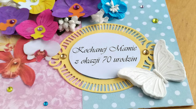 Dzisiaj przedstawiam karteczkę urodzinową dla miłośniczki storczyków. Motylki z lekkiej pasy plastycznej ozdobiłam perełkami w płynie. Z tymi żywymi kolorkami to już naprawdę zapachniało wiosną :)